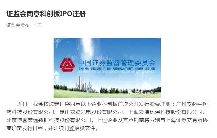 證監(jiān)會同意4家公司科創(chuàng)板IPO注冊