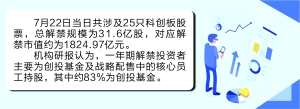 此外,面對高漲的股價,外界不可避免地關注到7月22日的科創(chuàng)板減持小考的潛在影響。根據(jù)最新統(tǒng)計,7月22日當日共涉及25只科創(chuàng)板股票,總解禁規(guī)模為31.6億股,對應解禁市值約為1824.97億元。