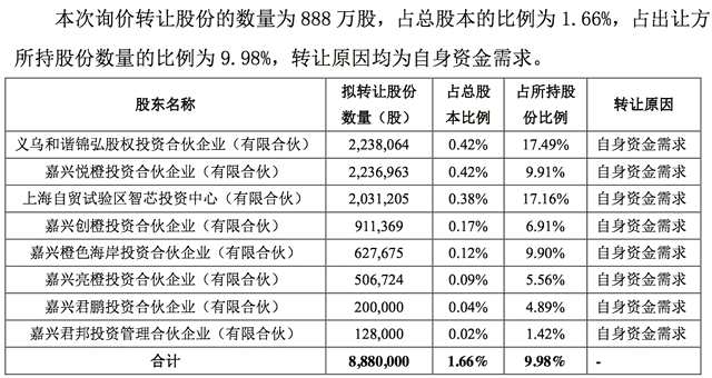 7月23日晚間,中微公司披露股東詢價轉讓計劃書,9名股東合計持有公司21.52%,擬通過詢價方式轉讓公司2.66%股份。