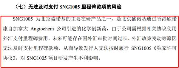 “SNG1005”作為盛諾基主要在研產(chǎn)品之一,是北京盛諾基通過香港欣諾康自加拿大Angiochem公司引進(jìn)的化學(xué)創(chuàng)新藥。盛諾基透露,由于需根據(jù)相關(guān)協(xié)議使用外匯支付里程碑費(fèi)用,未來可能存在因外匯審批時(shí)間過長、外匯政策變動(dòng)等原因無法及時(shí)支付里程碑款項(xiàng),從而導(dǎo)致無法按時(shí)履行SNG1005《獨(dú)家許可協(xié)議》,對SNG1005項(xiàng)目研發(fā)產(chǎn)生不利影響。