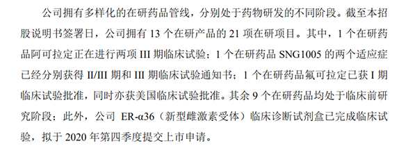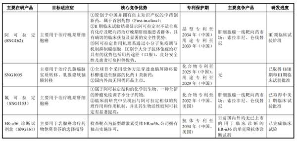 記者注意到,截至招股書簽署日,盛諾基擁有13個(gè)在研產(chǎn)品的21項(xiàng)在研項(xiàng)目,主要在研產(chǎn)品包括“阿可拉定 (SNG162) ”、“SNG1005”、“氟可拉定 (SNG1153)”、“ER-α36 診斷試劑盒(SNG361)”4款。