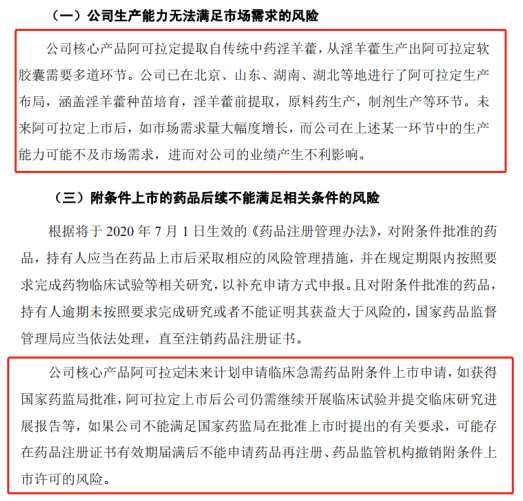 “阿可拉定”目前已進(jìn)入III期臨床試驗(yàn)。不過,盛諾基在招股書中透露,“阿可拉定”未來上市后,如市場需求量大幅度增長,而公司在上述某一環(huán)節(jié)中的生產(chǎn)能力可能不及市場需求,進(jìn)而影響公司業(yè)績;該產(chǎn)品未來計(jì)劃申請臨床急需藥品附條件上市申請,如果公司不能滿足國家藥監(jiān)局在批準(zhǔn)上市時(shí)提出的有關(guān)要求,可能存在藥品注冊證書有效期屆滿后不能申請藥品再注冊、藥品監(jiān)管機(jī)構(gòu)撤銷附條件上市許可的風(fēng)險(xiǎn)。