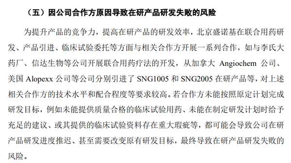 此外,對于如“SNG1005”和從美國Alopexx公司等企業(yè)分別引進(jìn)的“SNG2005”等合作研發(fā)產(chǎn)品,若合作方未能按照原定計(jì)劃完成研發(fā)目標(biāo),都可能會(huì)導(dǎo)致盛諾基在研產(chǎn)品研發(fā)進(jìn)度推遲、甚至需要改變原有研發(fā)目標(biāo),最終導(dǎo)致在研產(chǎn)品研發(fā)失敗的風(fēng)險(xiǎn)。