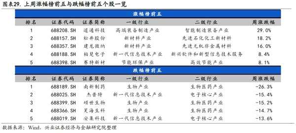 3)行情方面,以市值加權(quán)收盤價衡量,上周科創(chuàng)板整體下跌5.5%,科創(chuàng)50下跌2.4%,創(chuàng)業(yè)板跌0.7%,全部A股漲0.4%,維持寬幅震蕩。上周信息技術(shù)產(chǎn)業(yè)漲跌互現(xiàn),上市滿兩周的個股中,道通科技、松井股份、建龍微納、柏楚電子、賽特新材分列漲幅榜前五,南新制藥、杰普特、【碩世生物(688399)、股吧】、昊海生科、安集科技分列跌幅榜前五。