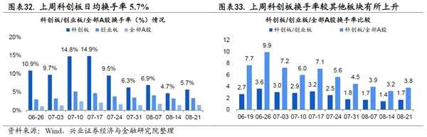 上周科創(chuàng)板日均換手率5.7%,較前兩周的4.7%上升1個百分點。與創(chuàng)業(yè)板比較,科創(chuàng)板換手率比為1.7,較前兩周的1.4上升0.3。與全部A股比較,科創(chuàng)板換手率比為3.8,較前兩周的3.2上升0.6。