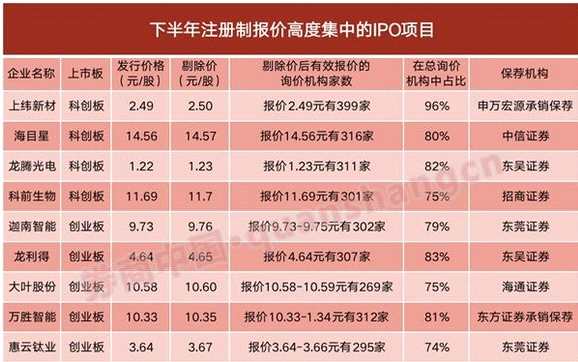 事實上,根據(jù)券商中國記者梳理統(tǒng)計下半年注冊制逾30家IPO項目的詢價結(jié)果,意外地發(fā)現(xiàn)“報價高度趨同”的現(xiàn)象事實上不止上緯新材一家。比如科創(chuàng)板龍騰光電IPO項目中,參與詢價的機(jī)構(gòu)投資者共有377家,其中有311家機(jī)構(gòu)投資者報出1.22元,占比82%。類似情況的IPO項目還有科創(chuàng)板企業(yè)科前生物、海目星,創(chuàng)業(yè)板企業(yè)龍利得、萬勝智能、【大葉股份(300879)、股吧】、迦南智能、惠云鈦業(yè)。