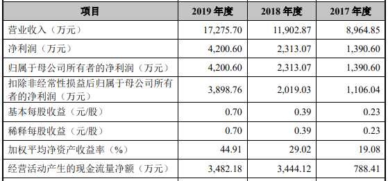 2017年至2019年,天臣醫(yī)療營(yíng)業(yè)收入分別為8964.85萬元、1.19億元和1.73億元;銷售商品、提供勞務(wù)收到的現(xiàn)金分別為1.01億元、1.36億元和1.91億元;凈利潤(rùn)分別為1390.60萬元、2313.07萬元、4200.60萬元,歸屬于母公司所有者的凈利潤(rùn)分別為1390.60萬元、2313.07萬元、4200.60萬元,經(jīng)營(yíng)活動(dòng)產(chǎn)生的現(xiàn)金流量?jī)纛~分別為788.41萬元、3444.12萬元和3482.18萬元。