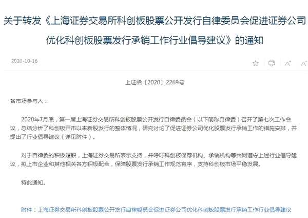 對于科創(chuàng)板的發(fā)行工作,科創(chuàng)板近期還有一些新的規(guī)則倡議出臺。10月16日,上交所轉(zhuǎn)發(fā)了《上海證券交易所科創(chuàng)板股票公開發(fā)行自律委員會促進(jìn)證券公司優(yōu)化科創(chuàng)板股票發(fā)行承銷工作行業(yè)倡導(dǎo)建議》,倡議內(nèi)容集中于促進(jìn)證券公司優(yōu)化股票發(fā)行承銷工作的措施安排,包括倡議科創(chuàng)板公司將首發(fā)前股份托管于保薦機(jī)構(gòu)、IPO戰(zhàn)略配售資格主承銷商核查披露要點(diǎn)等2項(xiàng)內(nèi)容。
