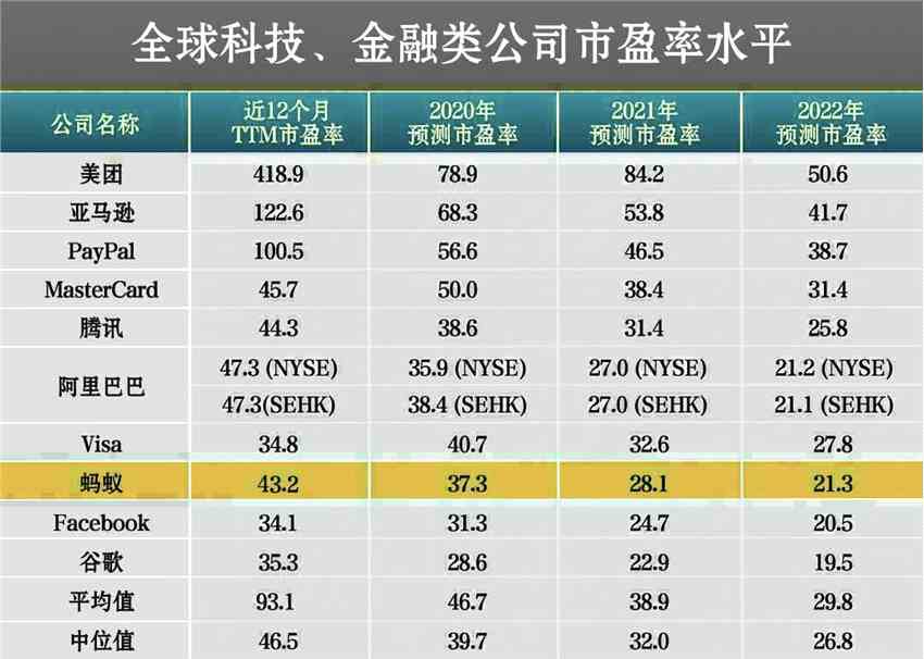 中金、花旗、摩根大通和摩根士丹利等機(jī)構(gòu),近期通過(guò)研究報(bào)告預(yù)測(cè)了螞蟻未來(lái)2年的凈利潤(rùn)水平。根據(jù)這些機(jī)構(gòu)的預(yù)測(cè),郭荊璞表示,如果以2800億美金估值測(cè)算,螞蟻2020、2021及2022年的預(yù)測(cè)市盈率平均值,分別為37倍、28倍、21倍。