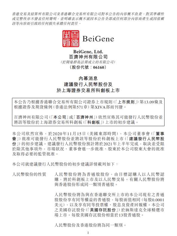百濟神州公告稱,董事會批準可能發(fā)行人民幣股份并將該等股份于科創(chuàng)板上市的初步建議,預計將于2021年上半年完成。