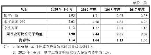 報告期內(nèi),海泰科存貨金額分別為1.22億元、1.88億元、2.37億元、2.52億元,占流動資產(chǎn)的比例分別為50.96%、50.83%、56.10%、53.44%。公司存貨周轉(zhuǎn)率下滑,分別為1.36、1.13、1.04、1.14,低于同行業(yè)可比公司平均存貨周轉(zhuǎn)率2.58、2.65、2.44、1.90。