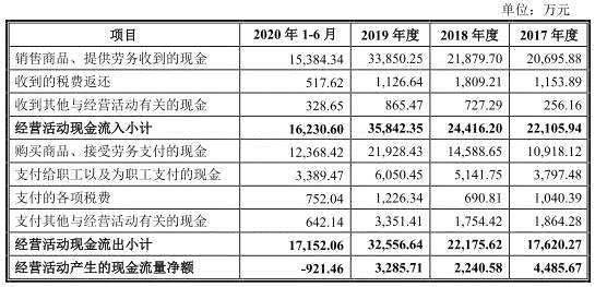 2017年至2020年1-6月,海泰科實現(xiàn)營業(yè)收入分別為2.22億元、2.72億元、3.42億元、2.01億元,公司銷售商品、提供勞務收到的現(xiàn)金分別為2.07億元、2.19億元、3.39億元、1.54億元。