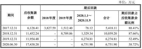 報告期各期末,公司應收賬款期后回款金額分別為5418.11萬元、1.00億元、6274.81萬元、6751.90萬元,期后回款占應收賬款余額比例88.41%、87.66%、52.49%、38.72%。