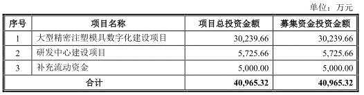 海泰科擬于深交所創(chuàng)業(yè)板上市,計劃公開發(fā)行不超過1600萬股,擬募集資金4.10億元,其中3.02億元用于大型精密注塑模具數(shù)字化建設項目、5725.66萬元用于研發(fā)中心建設項目、5000.00萬元用于補充流動資金。