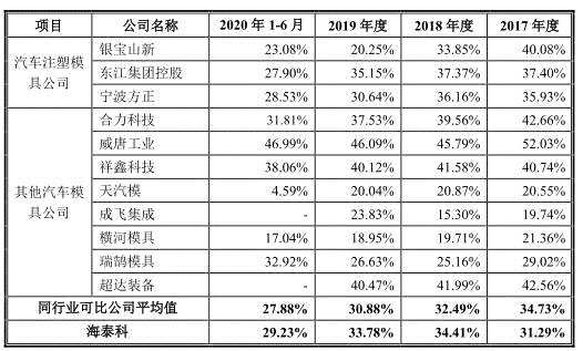 海泰科毛利率2019年起下滑,2017年至2020年1-6月,公司綜合毛利率分別為31.17%、34.36%、34.01%、29.31%,主營業(yè)務收入毛利率分別為31.29%、34.41%、33.78%和29.23%。同行業(yè)可比公司毛利率均值逐年下降,分別為34.73%、32.49%、30.88%、27.88%。