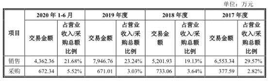 2017年至2020年1-6月,海泰科向同一主體銷售的金額分別為6553.34萬元、5201.93 萬元、7946.76萬元、4362.36萬元,向同一主體采購的金額分別為377.59萬元、733.06萬元、671.01萬元、672.34萬元。