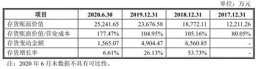 2020年6月末,公司存貨賬面價值相對上年末增加1565.07萬元,增長率為6.61%,存貨增加的主要原因系生產(chǎn)規(guī)模擴大導致存貨增加。