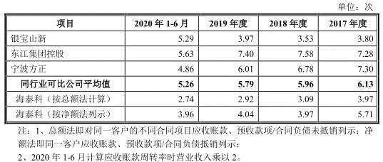 2017年至2020年6月30日,海泰科應收賬款余額分別為6128.41萬元、1.15億元、1.20億元、1.74億元,應收賬款賬面價值分別為5510.22萬元、1.03億元、1.06億元、1.57億元,占流動資產(chǎn)的比例分別為22.99%、27.89%、25.21%、33.20%。公司應收賬款周轉(zhuǎn)率下滑,分別為3.97、3.09、2.92、2.74,低于同行業(yè)可比公司平均應收賬款周轉(zhuǎn)率6.13、5.96、5.79、5.26。