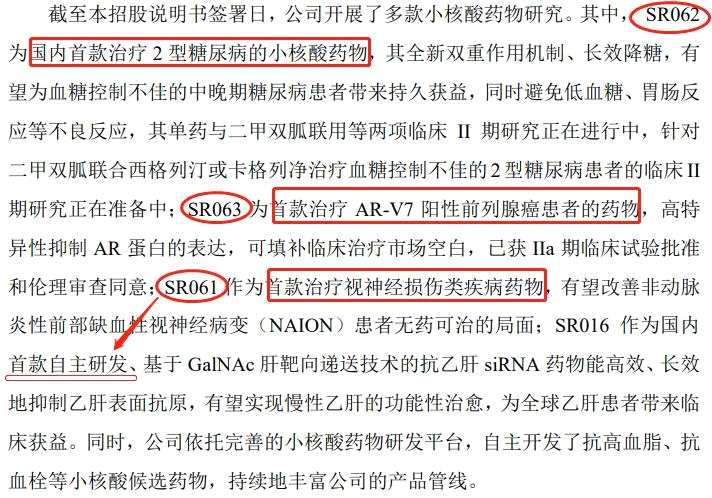 其中,SR061用于治療非動(dòng)脈炎性前部缺血性視神經(jīng)病變(NAION),處于II/III期臨床研究階段,SR062用于治療2型糖尿病,處于II期臨床研究階段,SR063用于治療AR-V7陽性的轉(zhuǎn)移性去勢抵抗性前列腺癌(mCRPC),處于IIa期臨床研究階段,SR016用于治療慢性乙肝,處于IND申請階段。