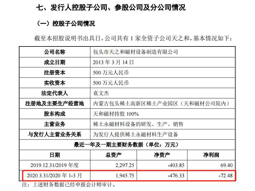 值得一提的是,天和磁材名下唯一一家全資子公司包頭市天之和磁材設(shè)備制造有限公司(下稱“天之和”)處于虧損狀態(tài)。