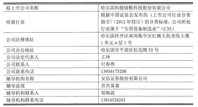 1月27日,了解到,哈爾濱科能熔敷科技股份有限公司(以下簡稱:科能熔敷)擬科創(chuàng)板IPO,公司已于2021年1月與安信證券股份有限公司簽署上市輔導(dǎo)協(xié)議,并于近日將相關(guān)情況予以公示。