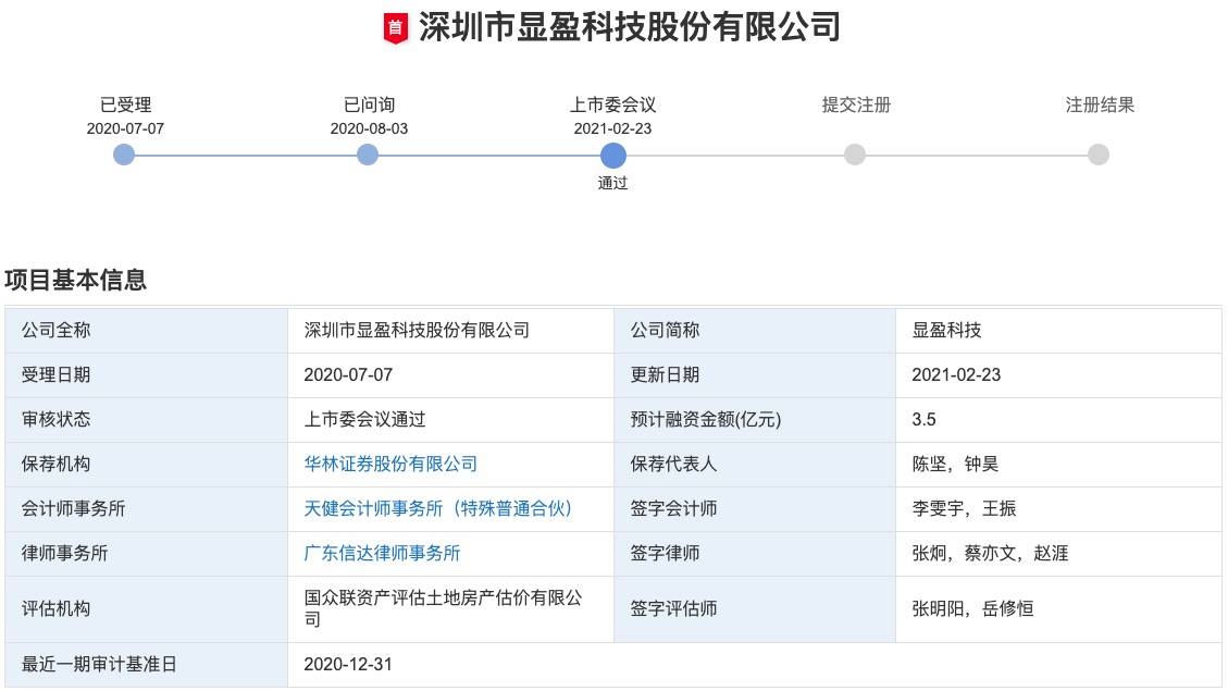摘要: 中華網(wǎng)財(cái)經(jīng)2月23日,創(chuàng)業(yè)板上市委2021年第12次審議會議結(jié)果顯示,深圳市顯盈科技股份有限公司(以下簡稱“顯盈科技”)首發(fā)獲通過。