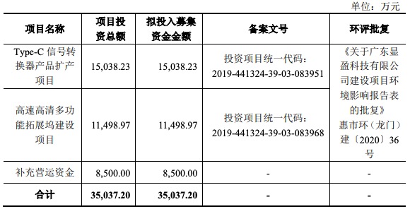 顯盈科技擬募集資金3.50億元,其中,1.50億元用于Type-C信號轉(zhuǎn)換器產(chǎn)品擴(kuò)產(chǎn)項(xiàng)目;1.15億元用于高速高清多功能拓展塢建設(shè)項(xiàng)目;8500萬元用于補(bǔ)充營運(yùn)資金。