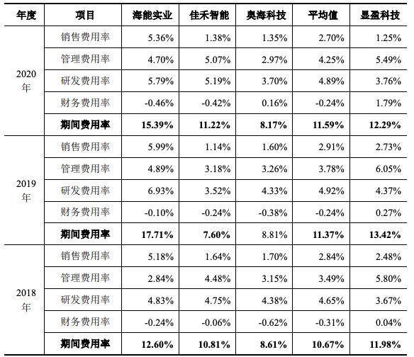 從研發(fā)費(fèi)用來看,顯盈科技研發(fā)費(fèi)用構(gòu)成主要包括為新產(chǎn)品、新工藝研發(fā)而發(fā)生的職工薪酬、研發(fā)領(lǐng)用材料投入、設(shè)計(jì)費(fèi)、房租、折舊及攤銷費(fèi)等。2017年至2020年,公司研發(fā)費(fèi)用分別為1205.16萬元、1468.06萬元、1839.41萬元和1,996.19萬元,占營業(yè)收入的比例分別為4.41%、3.67%、4.37%和3.76%,呈波動趨勢,且低于可比公司平均水平。