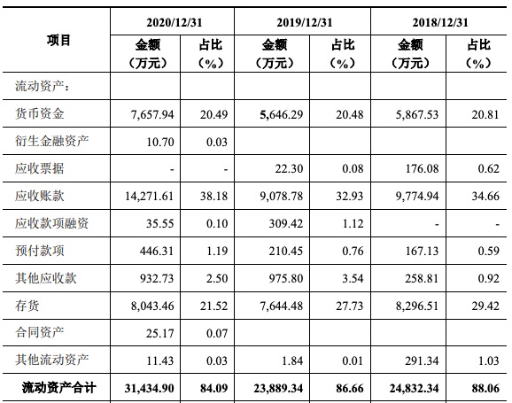 2017年至2019年及2020年上半年,顯盈科技應(yīng)收賬款余額分別為0.57億元、1.02億元、0.95億元和1.12億元,占資產(chǎn)總額的比例分別為28.47%、34.66%、32.93%和37.48%。