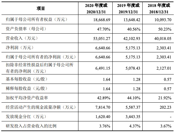 2018年至2020年公司研發(fā)費(fèi)用的直接投入主要為研發(fā)材料的投入,金額分別為307.37萬元、575.54萬元和471.02萬元,占各期研發(fā)費(fèi)用的比例分別為20.94%、31.29%和23.60%。