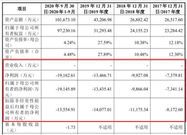 在此期間,瑞博生物歸母凈虧損分別為7341.14萬(wàn)元、9866.04萬(wàn)元、1.34億元、1.91億元;扣非凈虧損分別為8172.60萬(wàn)元、1.12億元、1.41億元、1.36億元。截至2020年9月末,其累計(jì)未彌補(bǔ)虧損6868.50萬(wàn)元。公司近幾年的主要財(cái)務(wù)數(shù)據(jù)如下: