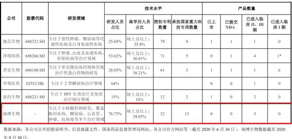 值得一提的是,相比如【微芯生物(688321)、股吧】、澤璟制藥、君實(shí)生物等產(chǎn)品已走向商業(yè)化或臨床尾期的創(chuàng)新藥公司,瑞博生物的研發(fā)人員占比最高,達(dá)76.75%,而公司在產(chǎn)品數(shù)量以及技術(shù)水平上卻并非遙遙領(lǐng)先,比如擁有79項(xiàng)授權(quán)專(zhuān)利的微芯生物研發(fā)人員占比還不及公司一半。瑞博生物與同行可比公司比較情況如下: