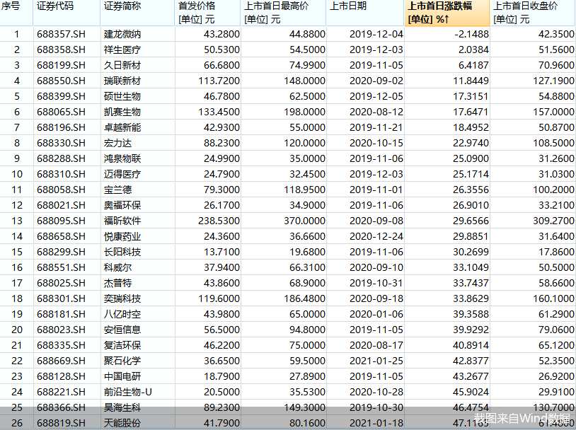 中芯國(guó)際、瀾起科技(688008,股吧)、中控技術(shù)、安博通(688168,股吧)、華峰測(cè)控等64股上市首日的股價(jià)漲幅則翻了2倍之多。其中上緯新材、【東方生物(688298)、股吧】、天智航、愛(ài)博醫(yī)療、龍騰光電等5股上市首日的股價(jià)漲幅翻了5倍之多。