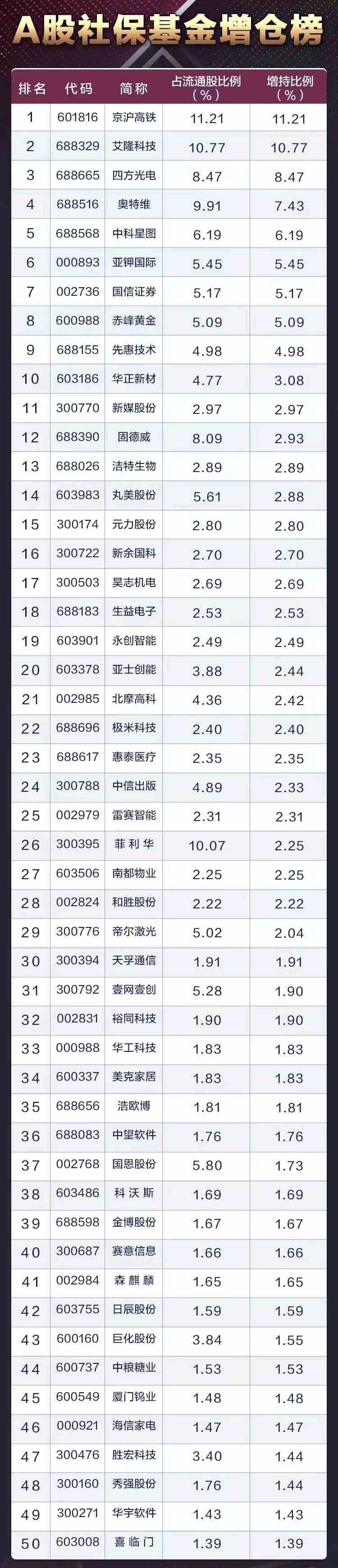 發(fā)布的《A股社保基金增倉(cāng)榜》顯示,基于一季度社?;鹬貍}(cāng)股的持有比例環(huán)比變動(dòng),共有74只股持倉(cāng)比例較上一季度增加超一個(gè)百分點(diǎn)。