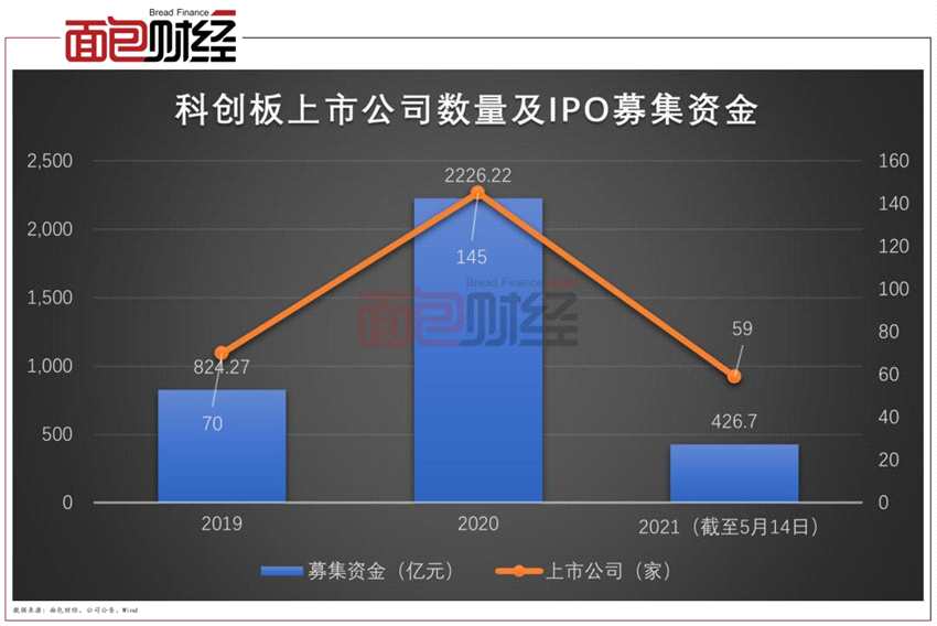 2021年以來截至5月14日,科創(chuàng)板已有59家上市公司,募集資金合計426.7億元。