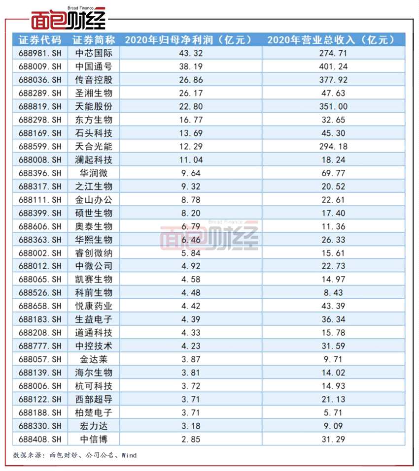 以下為2020年歸母凈利潤TOP30的科創(chuàng)板上市公司: