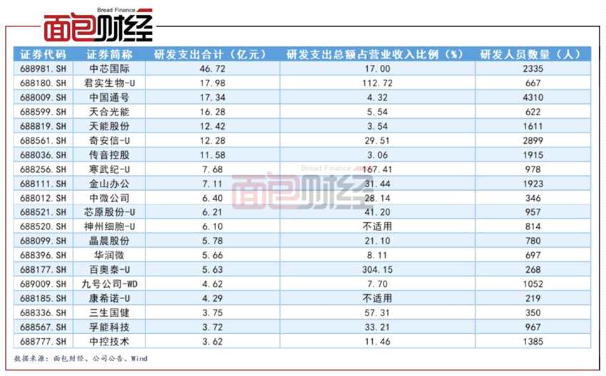Wind數(shù)據(jù)顯示,2020年科創(chuàng)板上市公司全年合計研發(fā)支出約為384.79億元,較上年增加72.11億元,同比增長23.06%。剔除采用第五套標(biāo)準(zhǔn)上市的公司后,其余公司的研發(fā)支出總額在營業(yè)收入中的占比為12.07%,較上年提升1.14個百分點。其中,中芯國際、君實生物(行情688180,診股)、中國通號(行情688009,診股)、天合光能(行情688599,診股)、天能股份(行情688819,診股)、奇安信(行情688561,診股)6家公司的研發(fā)支出超過10億元。另外,君實生物、寒武紀(jì)、金山辦公等多家公司的研發(fā)支出占比連續(xù)兩年超過30%。