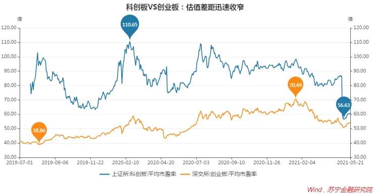 盈利的釋放快速壓低估值水平。隨著年報、1季報于4月底披露完畢,2021年5月的第一個交易日,科創(chuàng)板平均市盈率由節(jié)前的86.48倍驟降至59.01倍,處于板塊上市以來最低位置,與創(chuàng)業(yè)板的估值差距也大幅收窄。