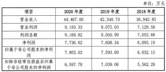 財(cái)務(wù)數(shù)據(jù)顯示,公司2018年、2019年、2020年?duì)I收分別為3.69億元、4.23億元、4.45億元;同期對(duì)應(yīng)的凈利潤(rùn)分別為6095.19萬元、7608.34萬元、7736.62萬元。