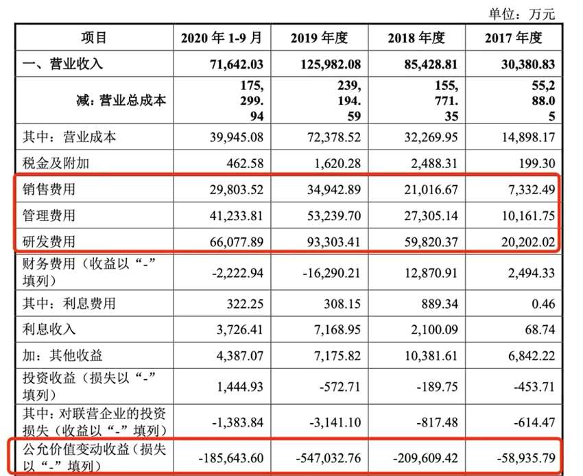 曠視招股書顯示,2017年-2020年9月公允價值變動收益分別為-5.89億元、-20.96億元、-54.7億元、-18.56億元。除去優(yōu)先股以公允價值計量導(dǎo)致的賬面虧損,曠視的虧損分別為1.85億元、7.04億元、11.7億元、9.9億元。
