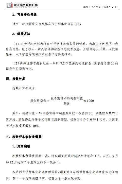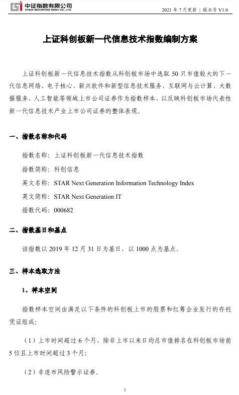 為及時(shí)反映科創(chuàng)板上市證券的表現(xiàn),為市場(chǎng)提供多維度投資標(biāo)的和業(yè)績(jī)基準(zhǔn),上海證券交易所和中證指數(shù)有限公司將于2021年8月16日正式發(fā)布上證科創(chuàng)板新一代信息技術(shù)指數(shù)。經(jīng)流動(dòng)性篩選后,上證科創(chuàng)板新一代信息技術(shù)指數(shù)從科創(chuàng)板市場(chǎng)中選取50只市值較大的下一代信息網(wǎng)絡(luò)、電子核心、新興軟件和新型信息技術(shù)服務(wù)、互聯(lián)網(wǎng)與云計(jì)算、大數(shù)據(jù)服務(wù)、人工智能等領(lǐng)域上市公司證券作為指數(shù)樣本,以反映科創(chuàng)板市場(chǎng)代表性新一代信息技術(shù)產(chǎn)業(yè)上市公司證券的整體表現(xiàn)。編制方案見(jiàn)上海證券交易所網(wǎng)站(www。sse.com.cn)和中證指數(shù)有限公司網(wǎng)站( www。csindex.com.cn )。