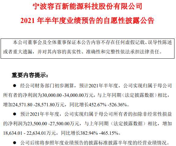 摘要: 容百科技(688005.SH)昨晚披露了2021年半年度業(yè)績預(yù)告的自愿性披露公告。經(jīng)公司財(cái)務(wù)部門初步測算,預(yù)計(jì)2021年半年度,公司實(shí)現(xiàn)歸屬于母公司所有者的凈利潤為3億元-3.4億元,