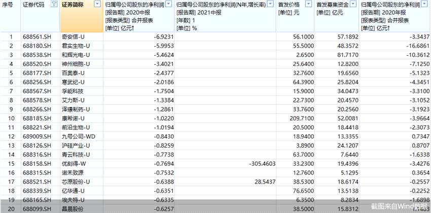 就2020年整年度來(lái)看,君實(shí)生物虧損幅度最大,公司報(bào)告期內(nèi)實(shí)現(xiàn)歸屬凈利潤(rùn)約為-16.69億元;其次是和輝光電,公司實(shí)現(xiàn)歸屬凈利潤(rùn)約為-10.36億元,也僅上述兩股2020年虧超10億元。