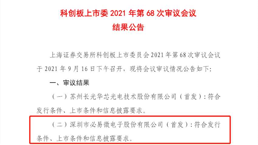 9月16日訊 9月16日,科創(chuàng)板上市委公告,深圳市必易微電子股份有限公司首發(fā)獲通過,將于上交所科創(chuàng)板上市。