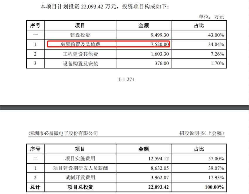 查詢招股書發(fā)現(xiàn),必易微的募投項(xiàng)目細(xì)看會(huì)發(fā)現(xiàn)項(xiàng)目中頻頻出現(xiàn)房屋購(gòu)置。在電源管理系列控制芯片開發(fā)及產(chǎn)業(yè)化項(xiàng)目中計(jì)劃深圳南山購(gòu)置辦公房產(chǎn),房屋購(gòu)置費(fèi)用11750萬(wàn)元,在該項(xiàng)目中費(fèi)用占比高達(dá)42.46%。在電機(jī)驅(qū)動(dòng)控制芯片開發(fā)及產(chǎn)業(yè)化項(xiàng)目中出現(xiàn)房屋購(gòu)置費(fèi)用4097萬(wàn)元,在該項(xiàng)目中費(fèi)用占比高達(dá)26.46%。而在必易微研發(fā)中心建設(shè)項(xiàng)目中又出現(xiàn)房屋購(gòu)置費(fèi)用7520萬(wàn)元,用于深圳南山購(gòu)置辦公產(chǎn)地。募投項(xiàng)目中房屋購(gòu)置費(fèi)用總計(jì)2.33億元,占總募集金額的比例高達(dá)36%。