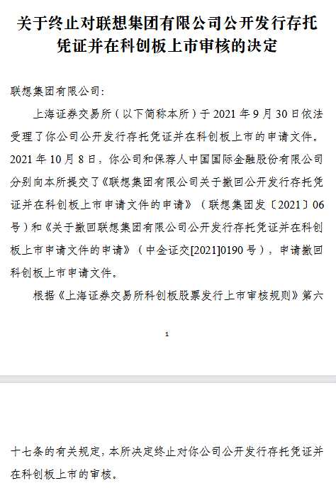 上交所稱,聯(lián)想集團和保薦機構(gòu)提交了申請撤回科創(chuàng)板上市申請文件,根據(jù)《上海證券交易所科創(chuàng)板股票發(fā)行上市審核規(guī)則》第六十七條的有關(guān)規(guī)定,決定終止聯(lián)想集團公開發(fā)行存托憑證并在科創(chuàng)板上市的審核。