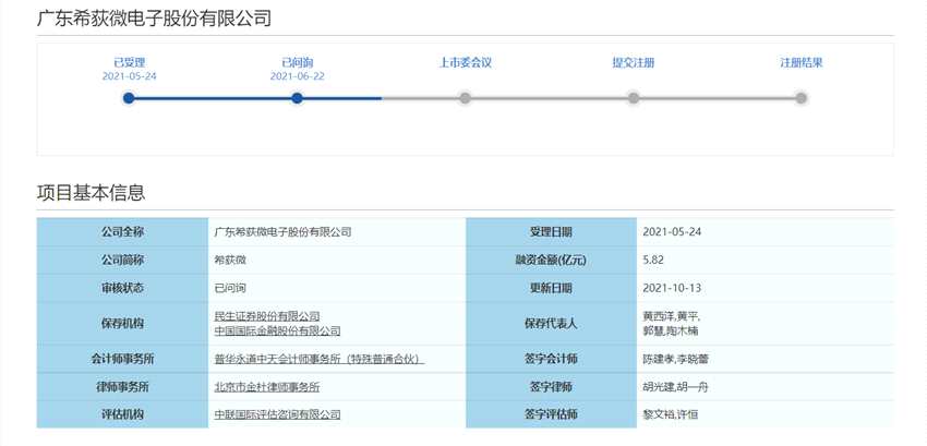 2021年10月13日上交所披露:上海證券交易所科創(chuàng)板上市委員會定于2021年10月20日上午9時(shí)召開2021年第77次上市委員會審議會議,審核廣東希荻微電子股份有限公司(首發(fā))。