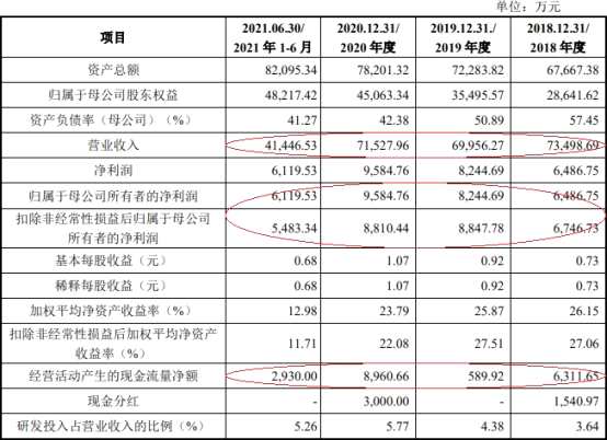 2018年至2021年1-6月,云路股份營業(yè)收入分別為7.35億元、7.00億元、7.15億元、4.14億元;歸屬于母公司所有者的凈利潤分別為6486.75萬元、8244.69萬元、9584.76萬元、6119.53萬元;扣除非經常性損益后歸屬于母公司所有者的凈利潤分別為6746.73萬元、8847.78萬元、8810.44萬元、5483.34萬元;經營活動產生的現(xiàn)金流量凈額分別為6311.65萬元、589.92萬元、8960.66萬元、2930.00萬元。