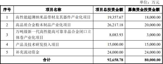 云路股份2021年11月22日披露的招股書顯示,公司擬募集資金8.00億元,分別用于高性能超薄納米晶帶材及其器件產業(yè)化項目、高品質合金粉末制品產業(yè)化項目、萬噸級新一代高性能高可靠非晶合金閉口立體卷產業(yè)化項目、產品及技術研發(fā)投入項目、補充流動資金。