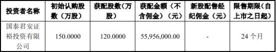 云路股份保薦機構安排依法設立的全資子公司國泰君安證裕投資有限公司參與本次發(fā)行戰(zhàn)略配售,國泰君安證裕投資有限公司依據《上海證券交易所科創(chuàng)板發(fā)行與承銷規(guī)則適用指引第1號——首次公開發(fā)行股票》第十八條規(guī)定確定本次跟投的股份數(shù)量為120.00萬股,占本次發(fā)行總量的4.00%,跟投金額為5595.60萬元。國泰君安證裕投資有限公司承諾本次跟投獲配股票的限售期為24個月。